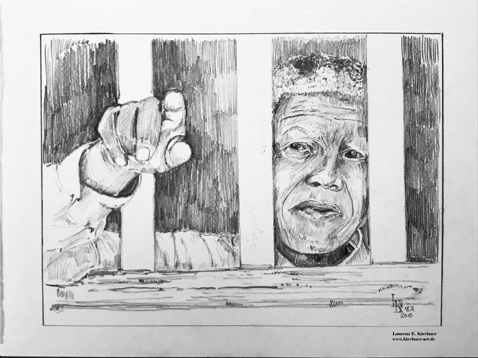 Auf der Zeichnung sieht man Nelson Mandela, wie er noch einmal, bereits Präsident von Südafrika, seine enge Gefängniszelle auf Robben Island besucht und nachdenklich aus dem Gitterfenster schaut.