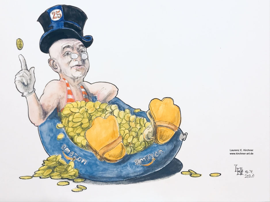 Im Sommer nimmt Dagobert Jeff Bezos, der Gründer von Amazon, gerne auch mal ein Talerbad draußen. Ist bissel luftiger als im klimatisierten Geldspeicher.