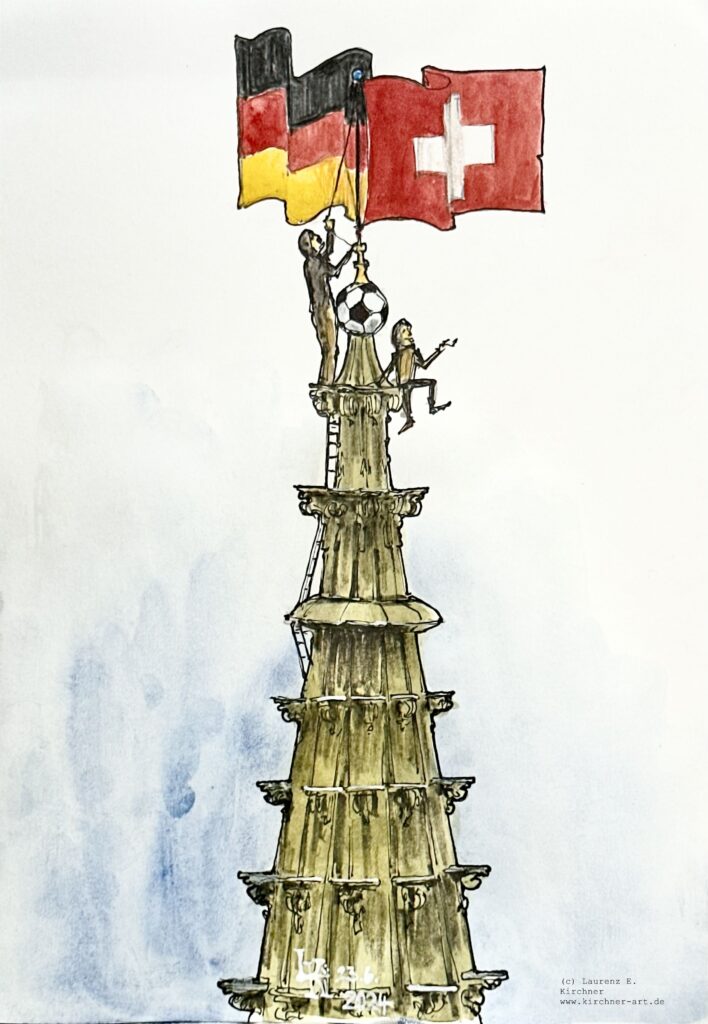 Die Kletteraktion am Lambertikirchturm galt dem heutigen Gruppenendspiel Deutschland gegen die Schweiz ! Die Eidgenossen brauchten etwas, was sie an ihre Schweizer Gipfel erinnern kann. Was lag näher, als die Fahne schon plazieren zu lassen, die jetzt passend gehisst wurde !