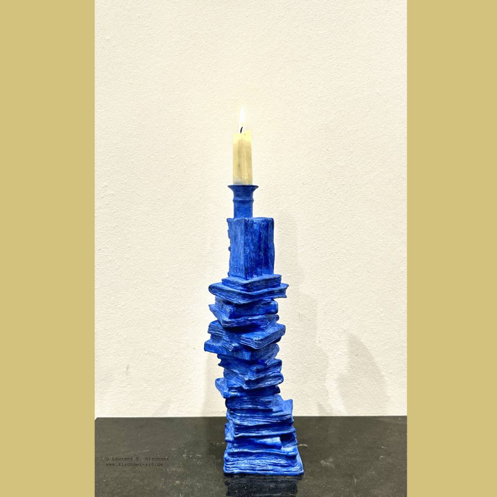 Blaue Bücher im Kerzenschein? Auf jeden Fall sind Bücher als Säule des Lichts unverzichtbar…!