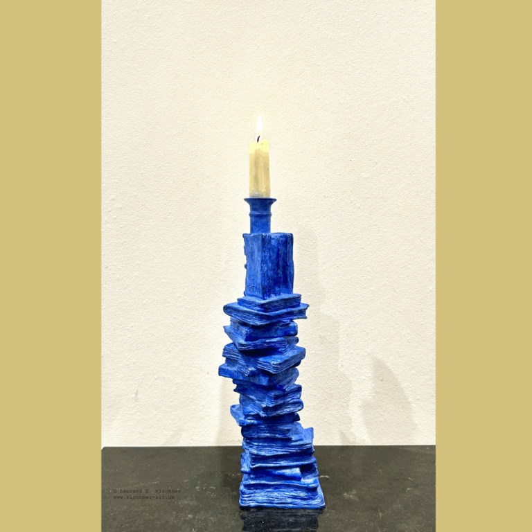 Bücher zur blauen Stunde? Blaue Bücher im Kerzenschein? Auf jeden Fall sind Bücher als Säule …