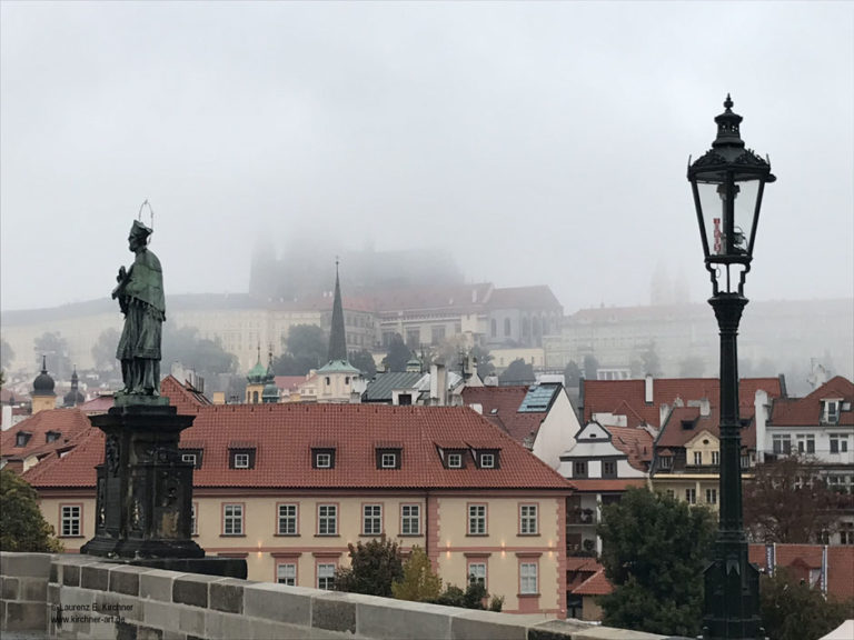 Der Gipfel im Nebel über der Prager Burg nur noch schemenhaft erkennbar. Alle sind abgereist, …