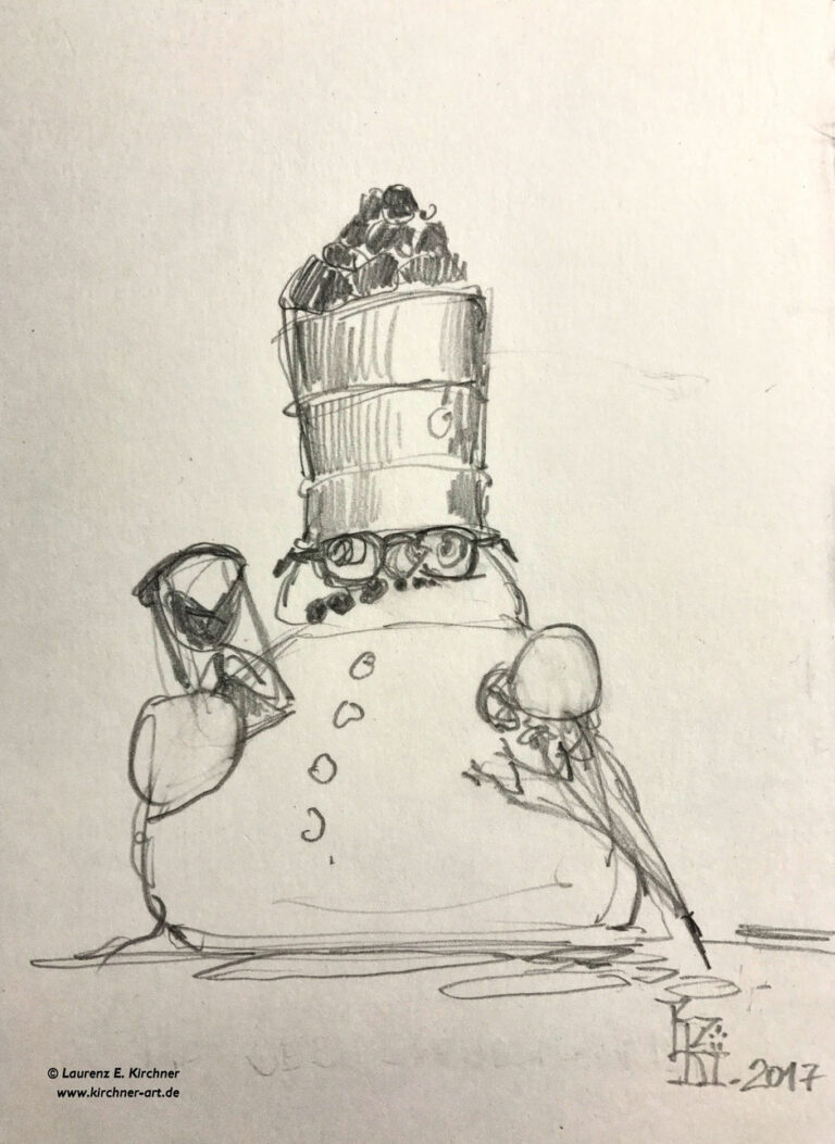 Auch wenn’s winterlich schneit, Kohle und Öl machen dem Schneemann immer mehr zu schaffen… Graphitzeichnung, …